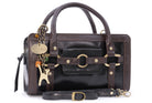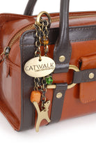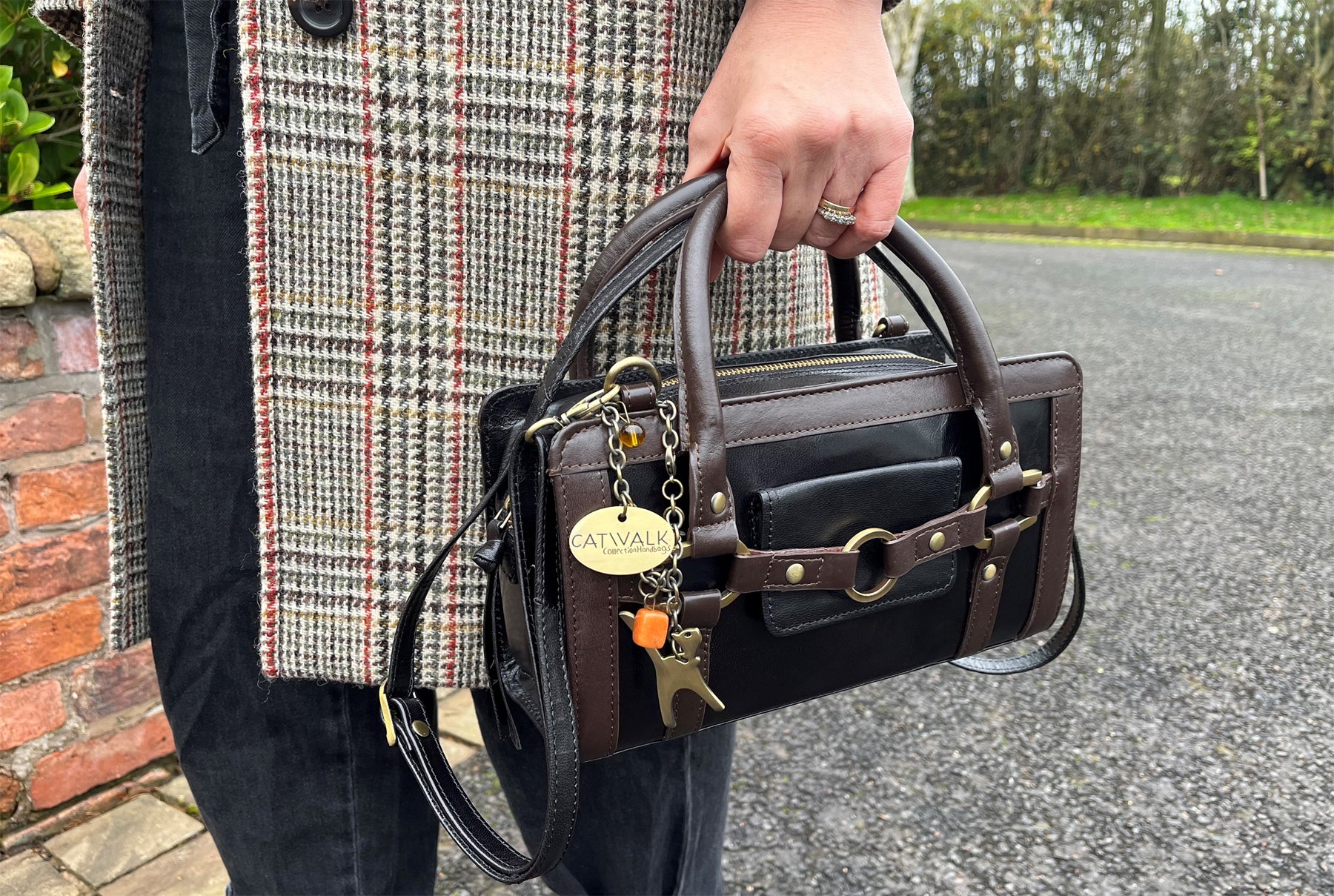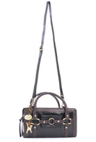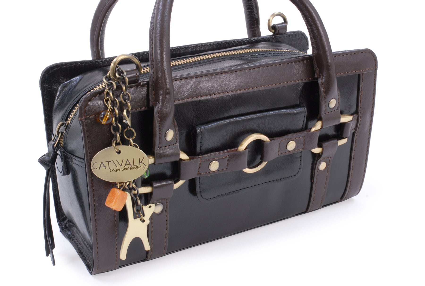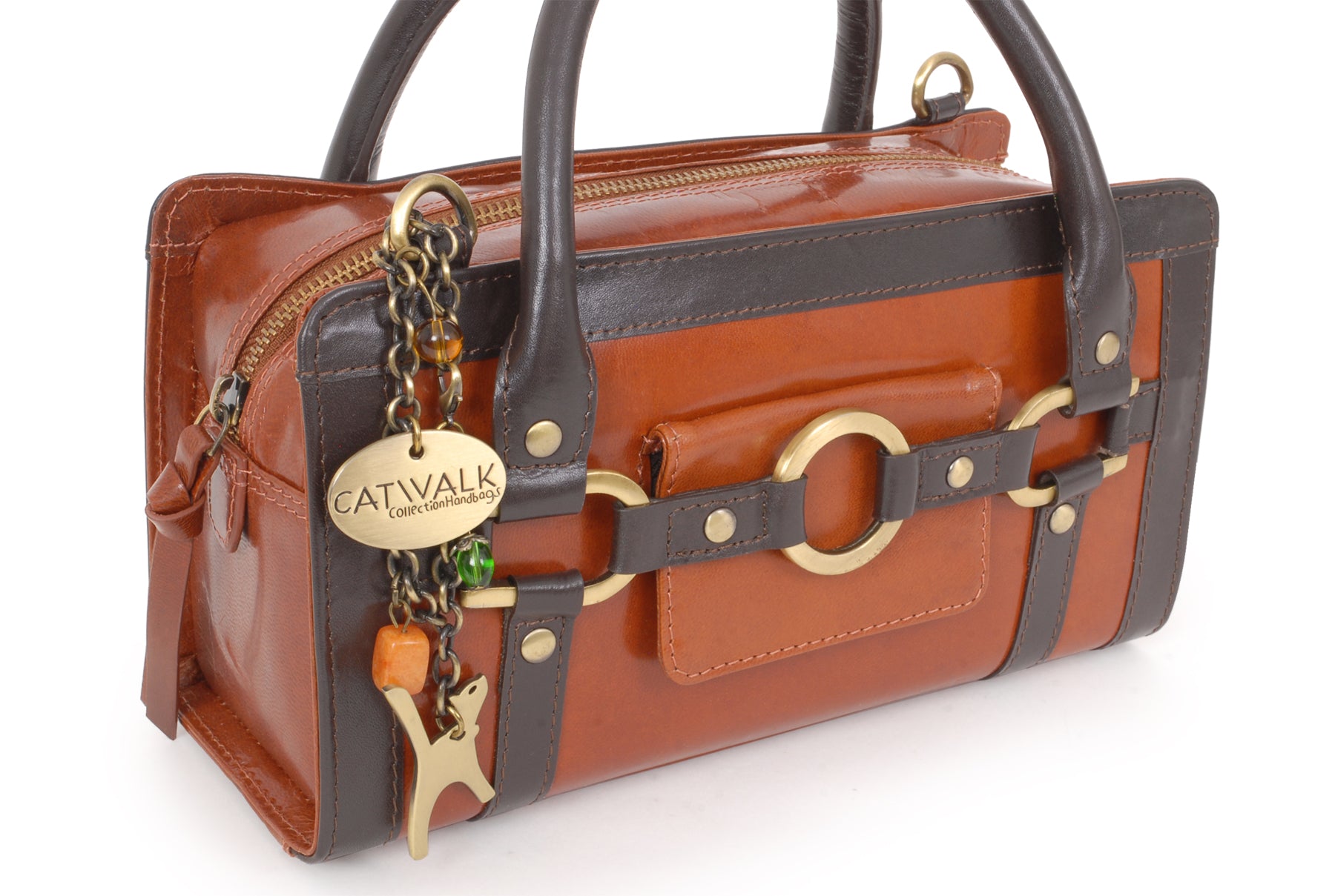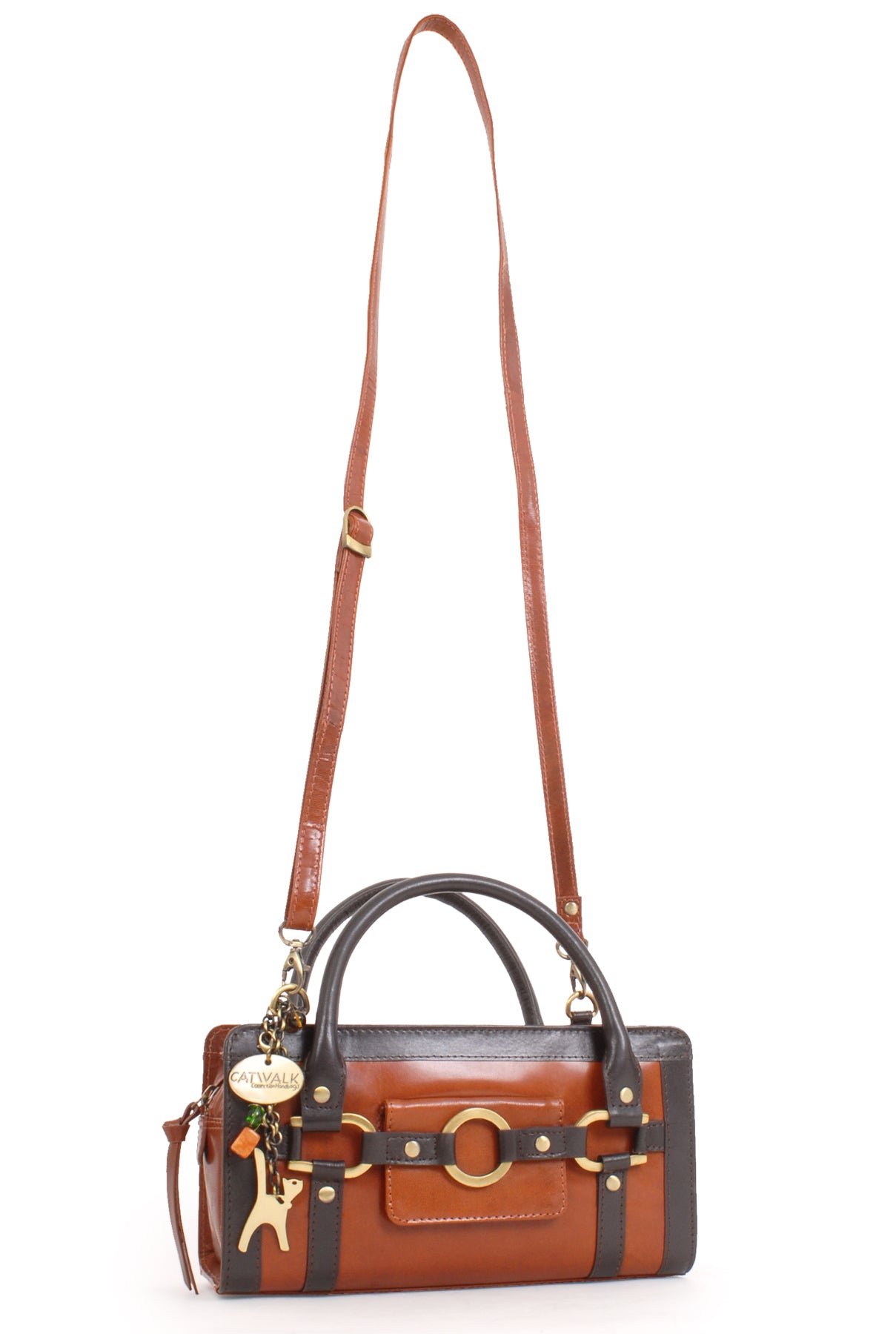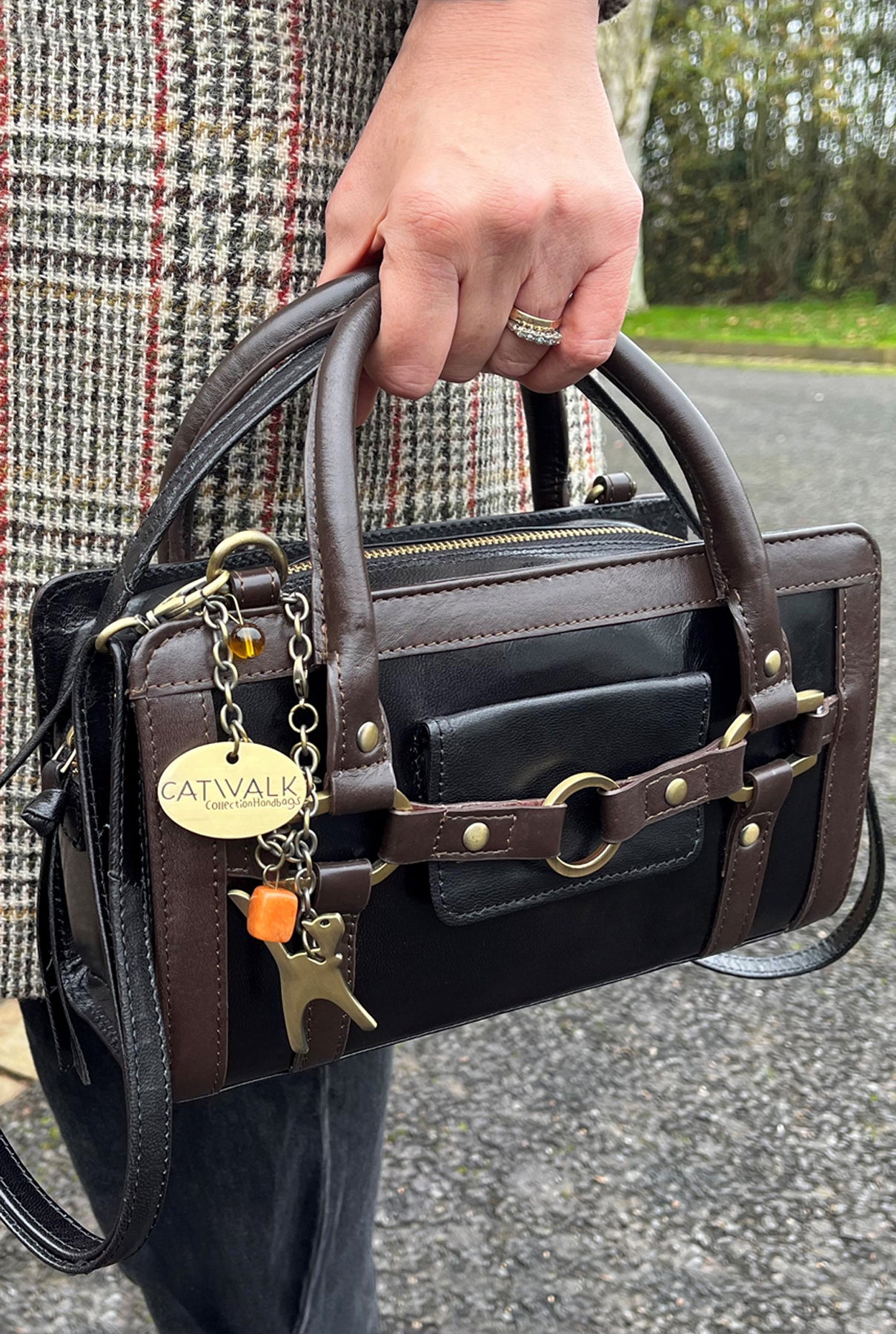 Made from smooth, polished leather with a satin finish.The structured, box-shaped design features defined edges, brass fittings and a stylish horse-bit detail on the front. This is a small to medium-sized bag.Organisational elements include dedicated pockets for credit cards and a mobile phone. Interior pockets are reinforced with leather trim. Rolled leather handles are designed for carrying by hand. An adjustable, detachable leather strap allows the bag to be worn over the shoulder or across the body. The bag fastens with a zip for a secure closure. The interior is lined with signature fabric. The base is flat for stability when placed on a surface. Designed to suit multiple occasions, this handbag is suitable for use at events such as weddings, birthdays, anniversaries, holidays, evenings out, seasonal gatherings, or as a practical option for day-to-day use.