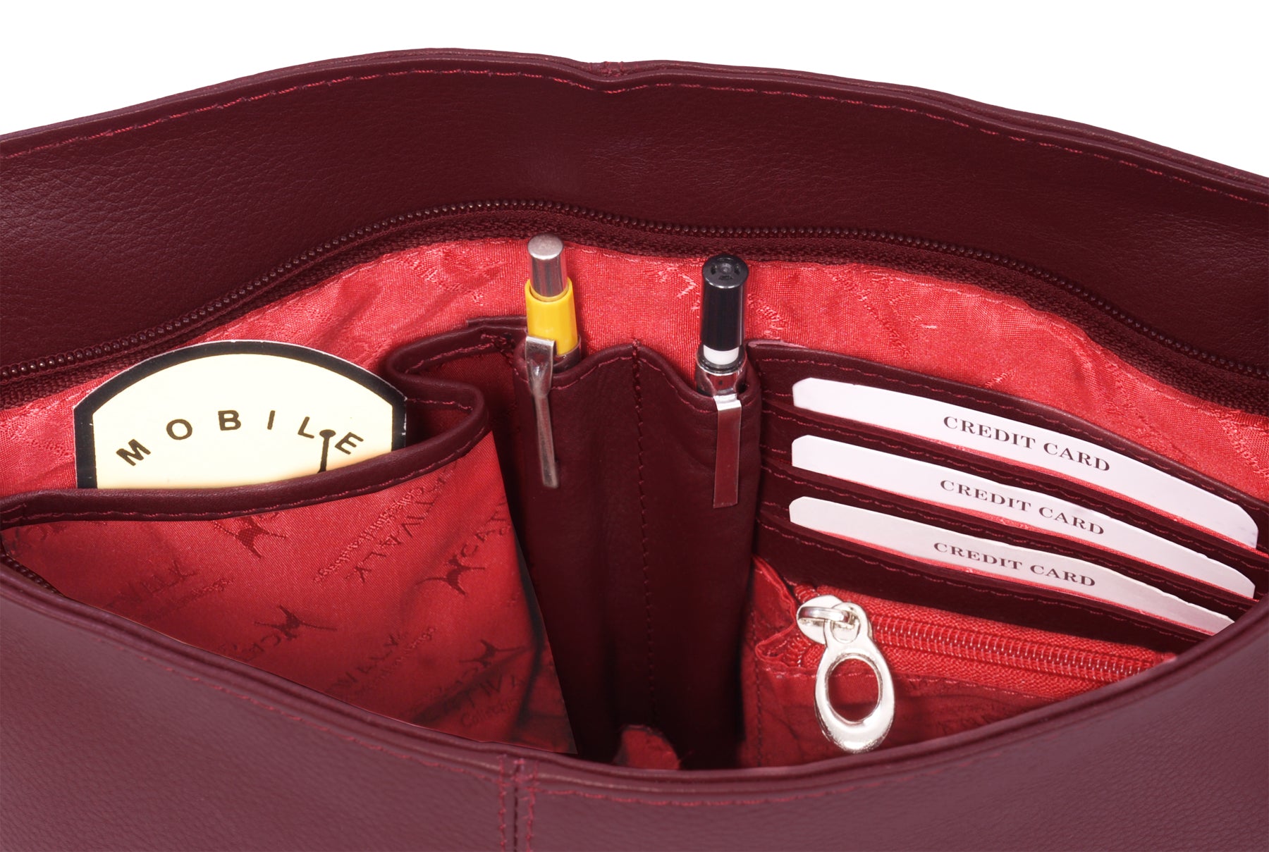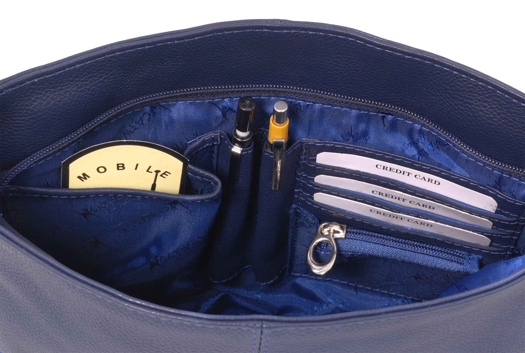 Pockets: 1 Main Compartment + 1 Interior Rear Zipped Pocket + 1 Interior Leather Mobile Phone Holder + 2 Leather topped Pen Holders + 3 Credit Card Holders + 1 Coin Pocket + 1 Key Fob + 2 Outer Front Zipped Pockets