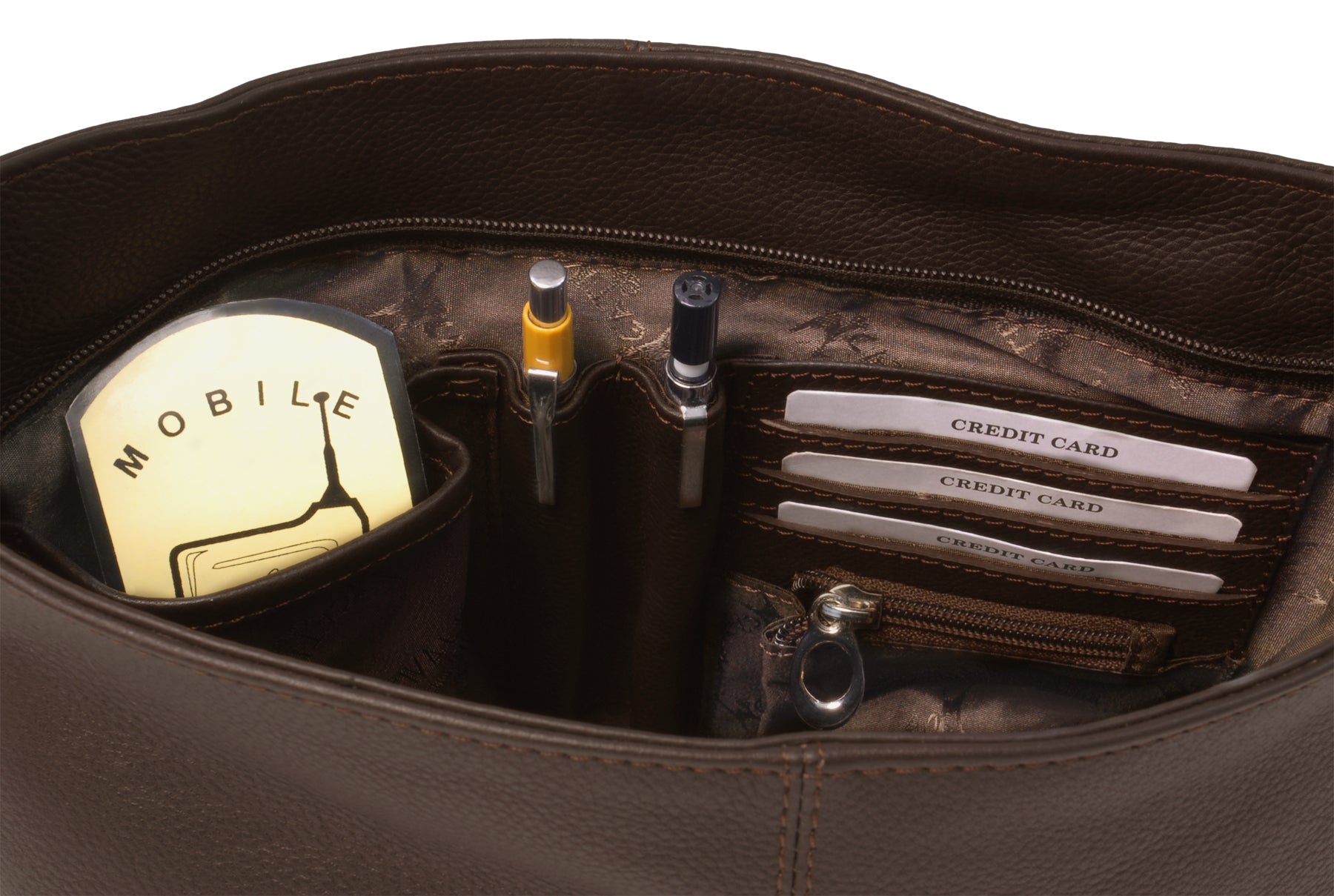 Organisational features include pockets for pens, credit cards and mobile phone.