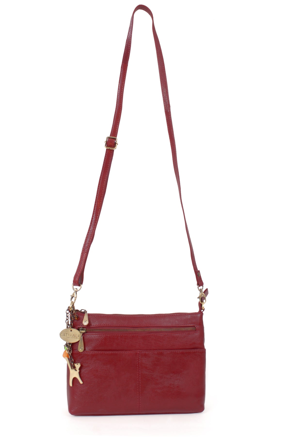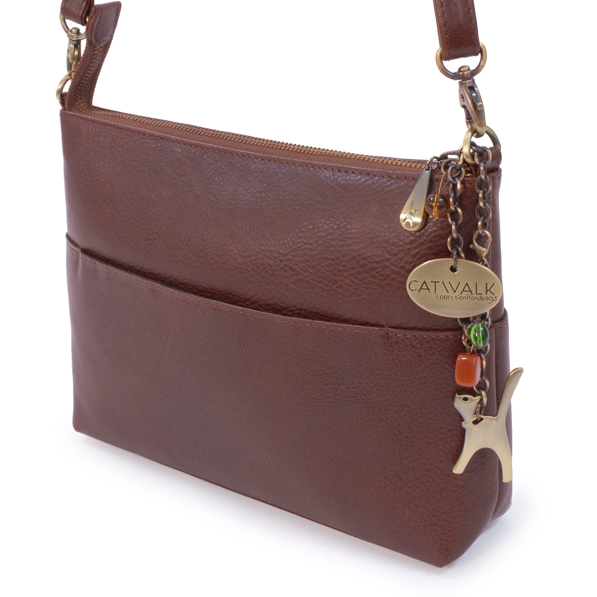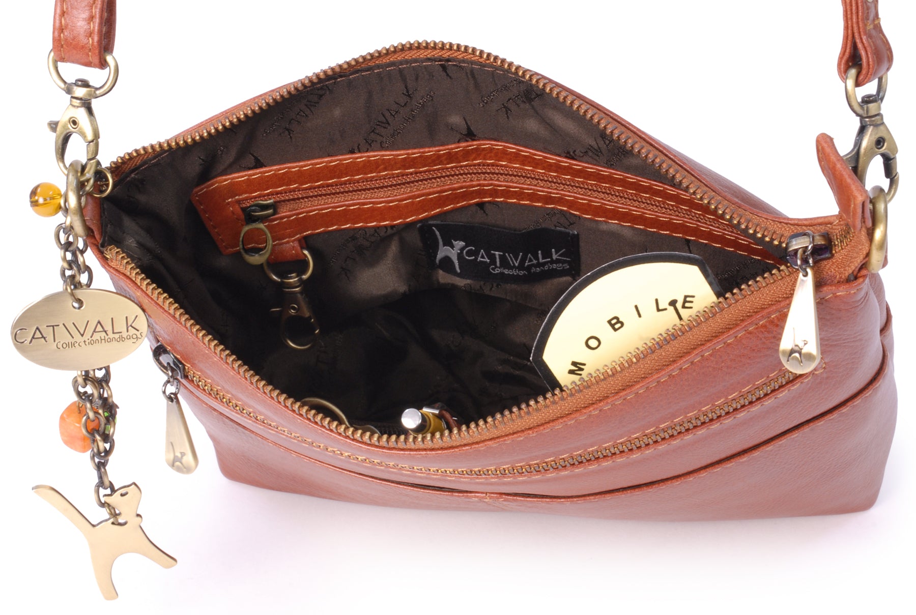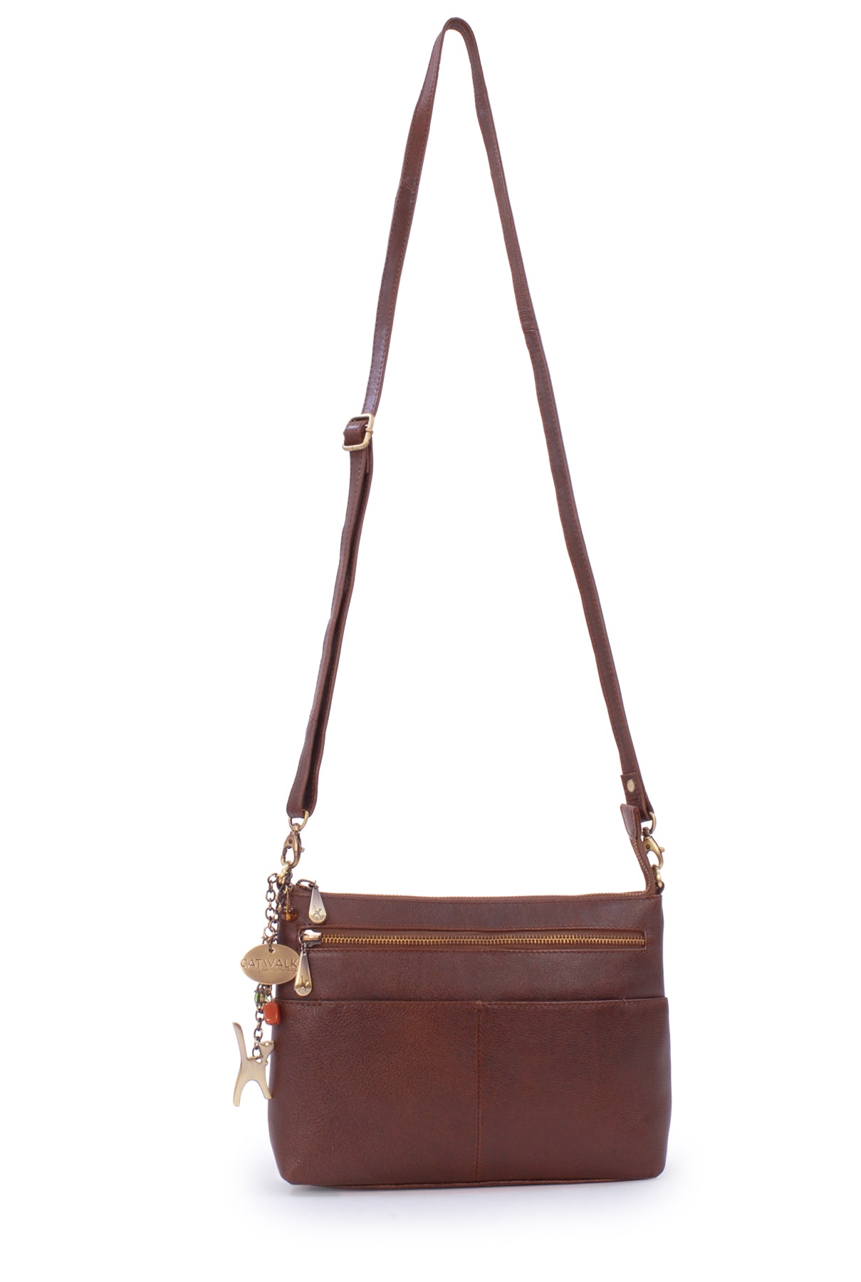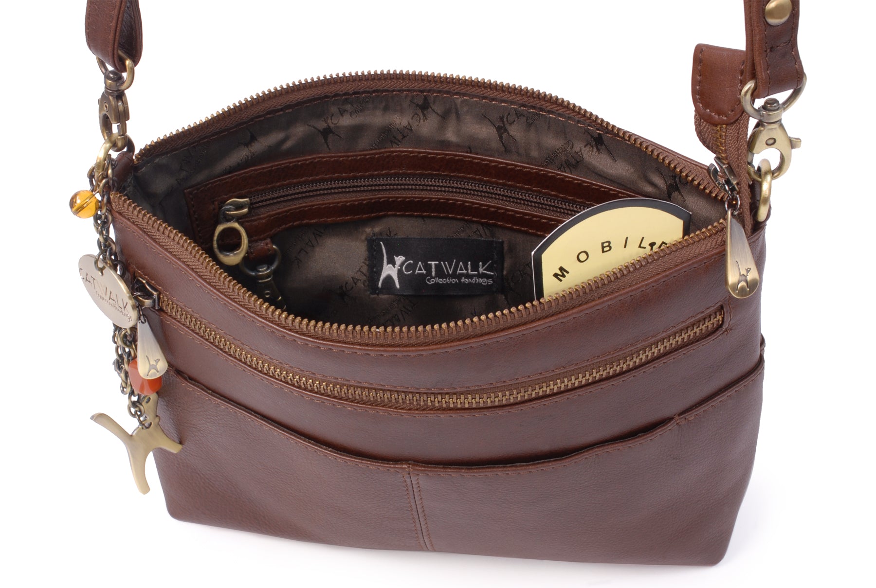 The adjustable, detachable leather strap allows the bag to be worn across the body, over the shoulder, or removed for use as a clutch bag. Metal brass zip detailing adds character, with each zip pull imprinted with the Catwalk Collection Cat Logo. Organisational features include internal pockets for pens, credit cards, and a mobile phone. The interior is fully lined with signature fabric, and pockets are reinforced with leather trim for added durability.