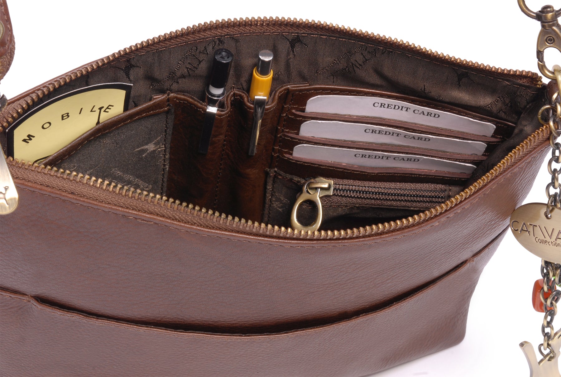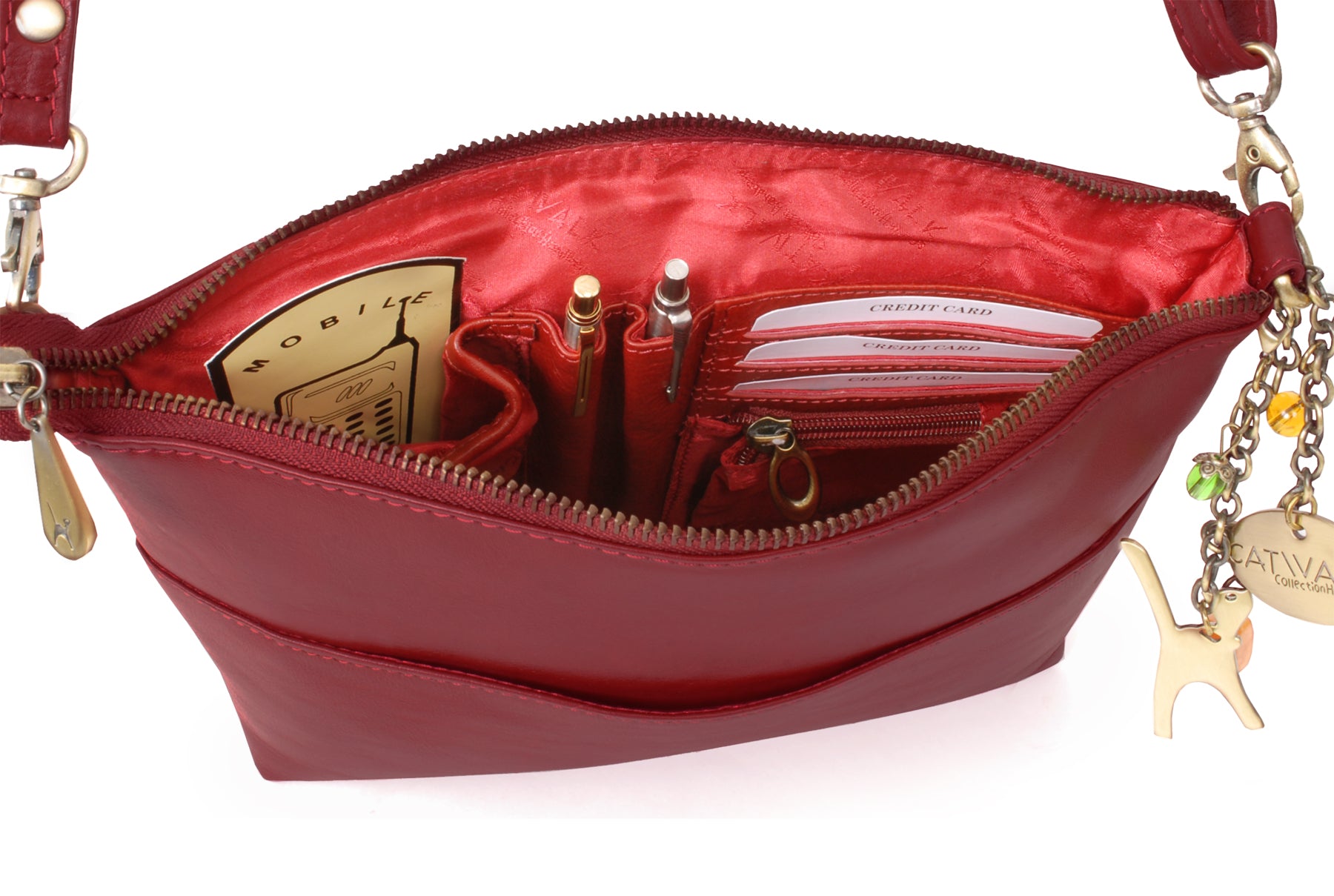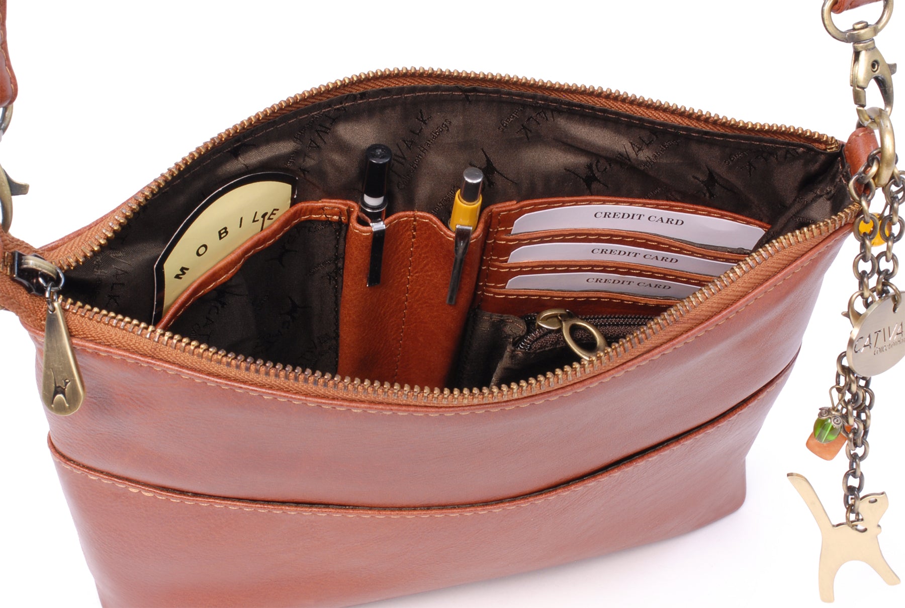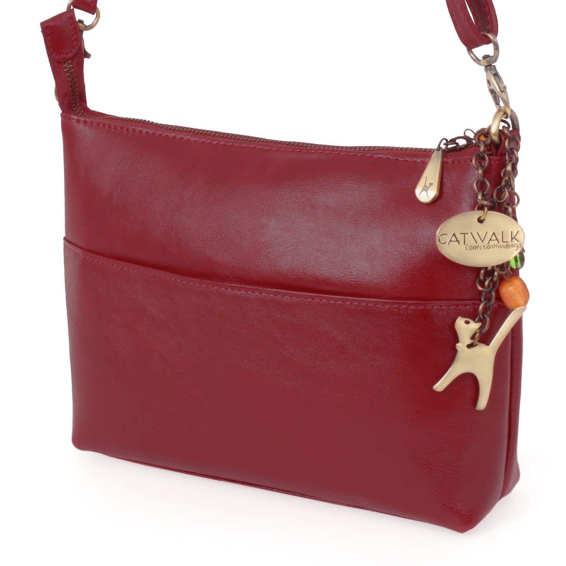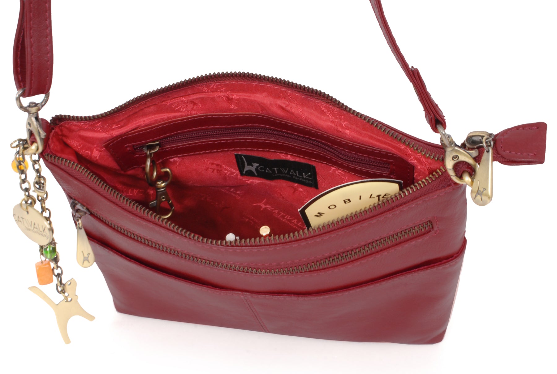 The adjustable, detachable leather strap allows the bag to be worn across the body, over the shoulder, or removed for use as a clutch bag. Metal brass zip detailing adds character, with each zip pull imprinted with the Catwalk Collection Cat Logo. Organisational features include internal pockets for pens, credit cards, and a mobile phone. The interior is fully lined with signature fabric, and pockets are reinforced with leather trim for added durability.